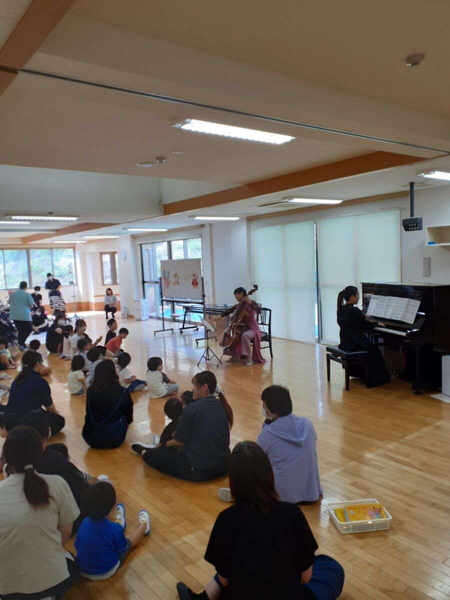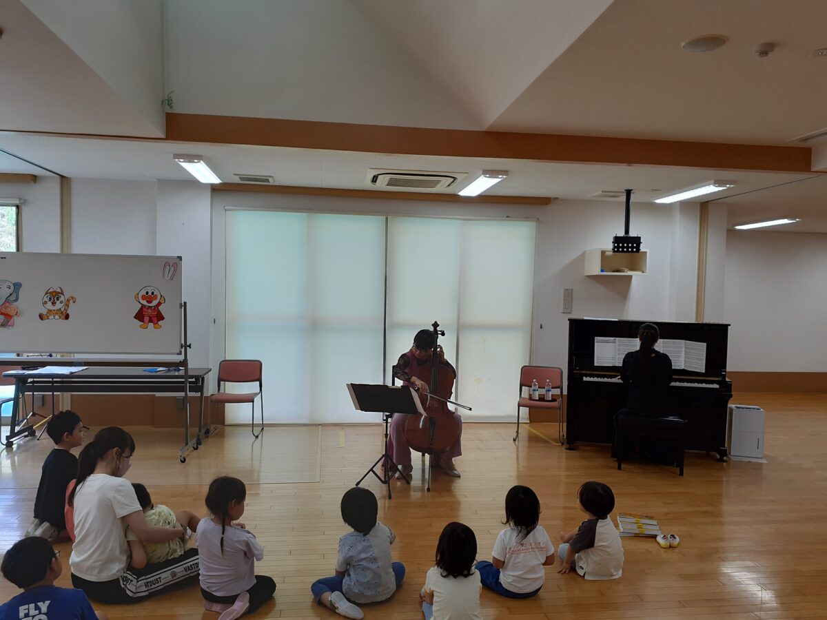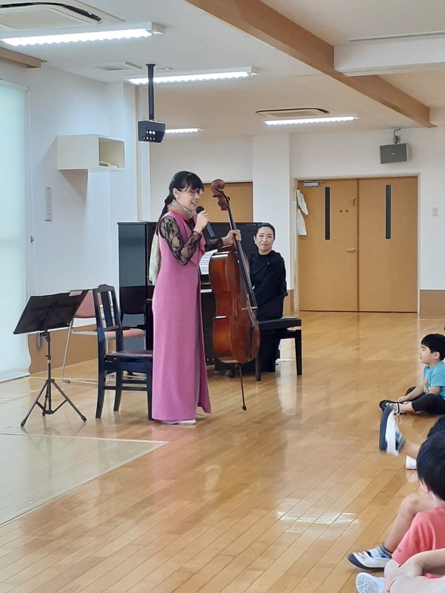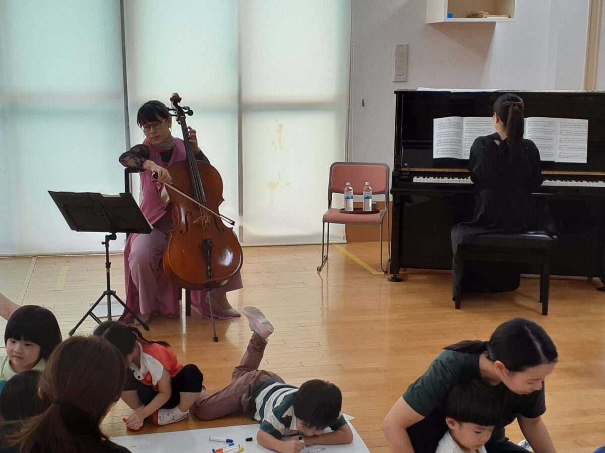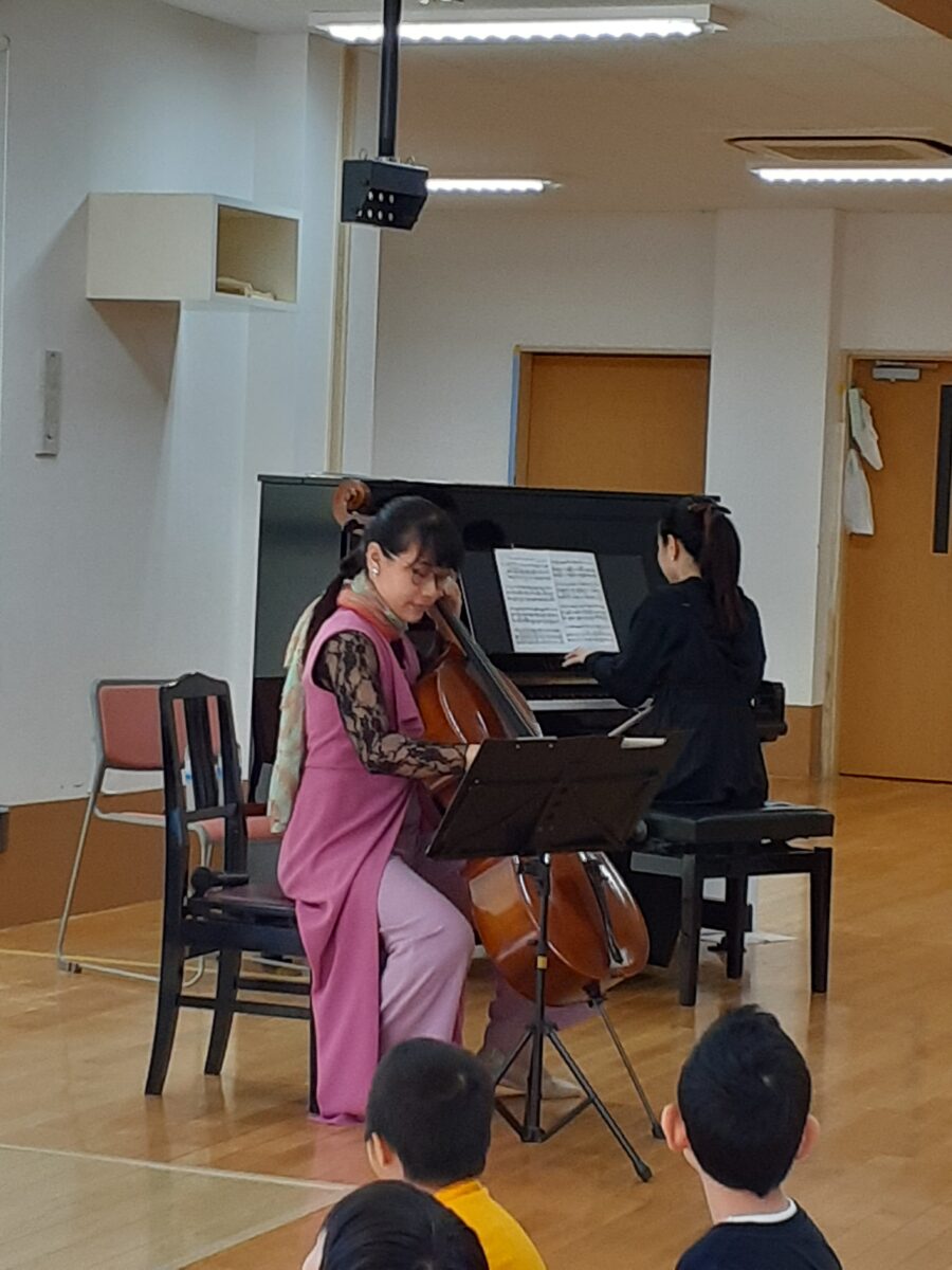 2025.10.29 10月行事(おでかけクラシックコンサート) 🎵~おでかけクラシックコンサートを開催しました~🎵 令和7年10月17日(金)、つばさ学園では月1行事「おでかけクラシックコンサート」を開催しました。今年は、チェロ奏者の河野里菜様とピアニストの竹下杏奈様をお招きし、心に響く素敵な演奏を披露していただきました。 子どもたちにとっては、チェロを間近で見るのは初めての体験だったようです。演奏が始まると、その深く温かい音色に引き込まれるように、みんな真剣な表情で聴き入っていました。チェロとピアノが織りなす美しいハーモニーに、会場全体がやさしい音に包まれました。 今回のプログラムは「動物」をテーマにした曲が多く、「ぞうさん」「白鳥」「猫」など、子どもたちにも親しみやすい内容でした。「ぞうさん」は日本の童謡ではなく、フランスの“ぞうさん”の曲で、子どもたちはいつもと違うぞうさんの姿を思い描いていました。「白鳥」では「この湖にはどんな動物たちが集まってくるかな?」と想像を膨らませながら耳を傾け、「猫」ではチェロの音色の中に猫の鳴き声のような音を感じ取り、「猫だ!」と嬉しそうに声をあげる姿も見られました。(実はピアノの音色にも猫の鳴き声が隠れていて、それに気づいた子も!。)普段なじみの少ないクラシック音楽が、子どもたちにとって身近で楽しいものになったようです。 また、コンサートの中では「アンパンマンの歌」をみんなで歌ったり、朝の集まりでおなじみの『だるまさん』の絵本を音楽付きで楽しんだりと、音と絵が一つになった臨場感ある時間を過ごしました。 音楽を通して、子どもたちの表情がどんどん輝いていくのが印象的でした。最後には、チェロとピアノの演奏を聴いて感じた気持ちを、画用紙にお絵描きして表現しました。思い浮かんだイメージや色を自由に描きながら、一人ひとりが音楽から感じた“心の動き”をのびのびと表していました。 河野様、竹下様、素敵な演奏をありがとうございました。子どもたちにとって、音楽の楽しさや表現する喜びを感じる貴重な時間となりました。 Post Share Pin it 9月行事(わくわく実験教室)