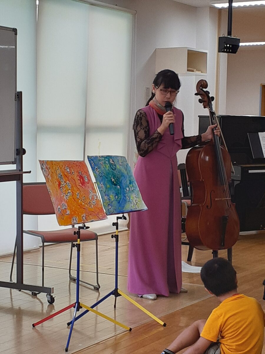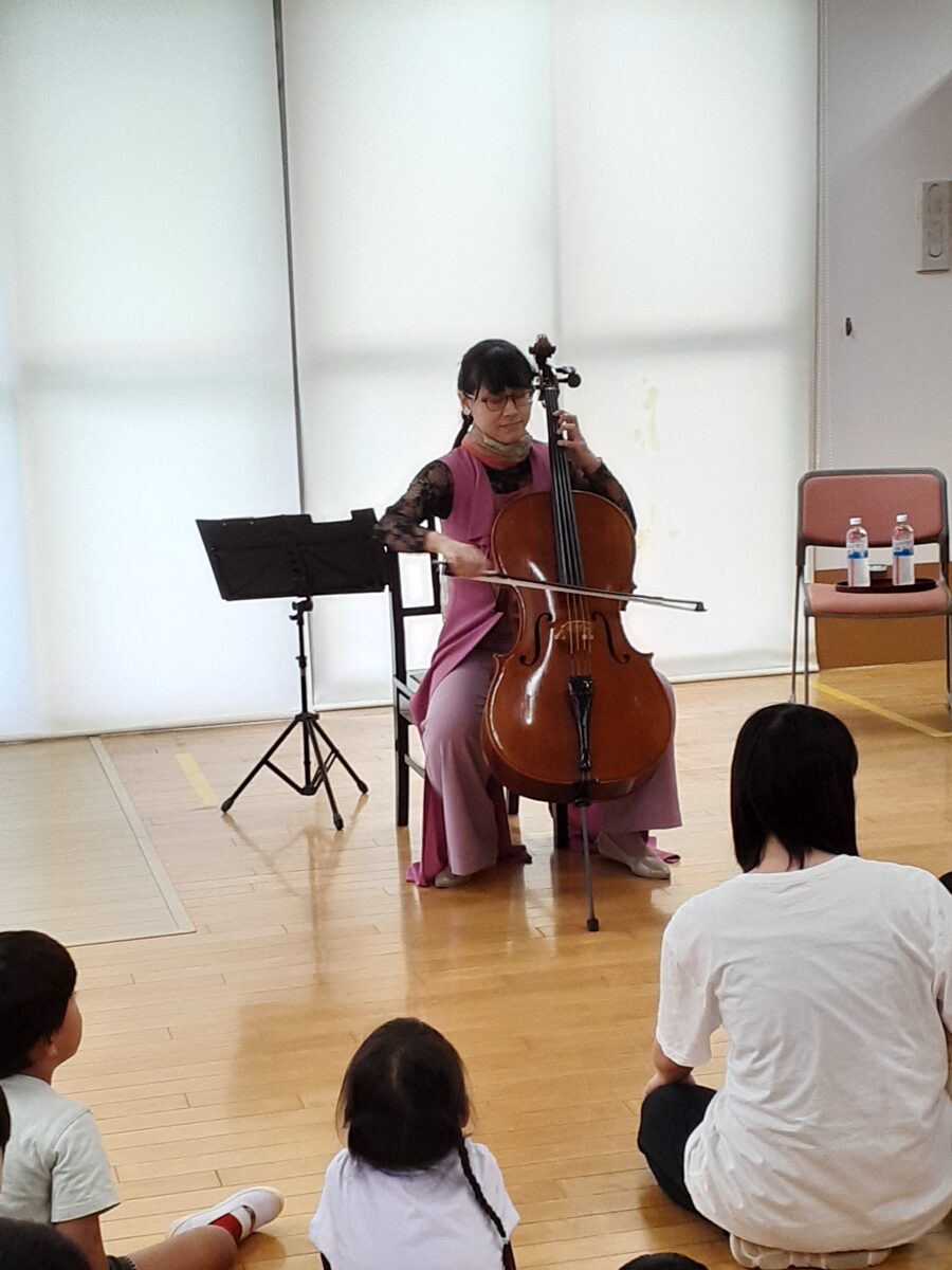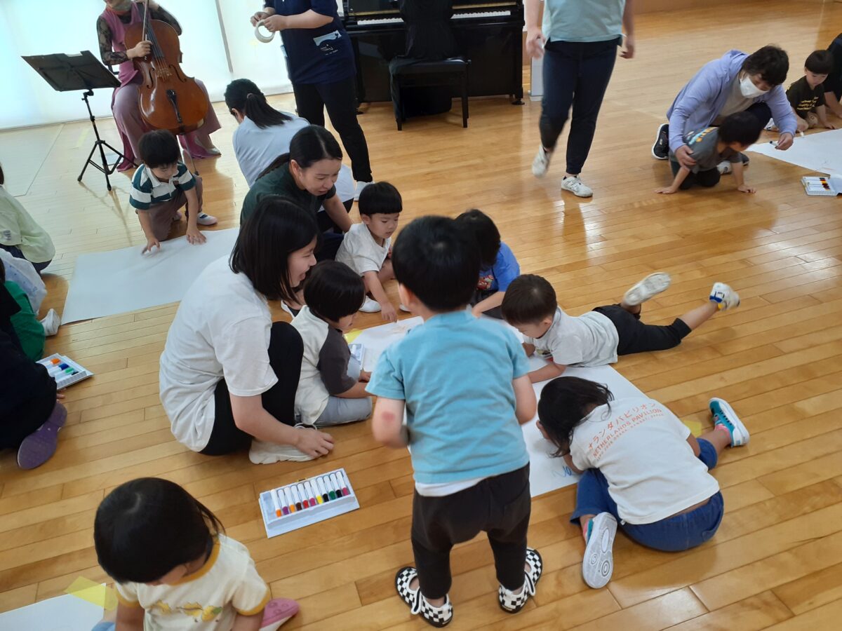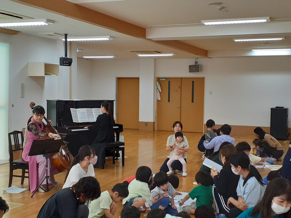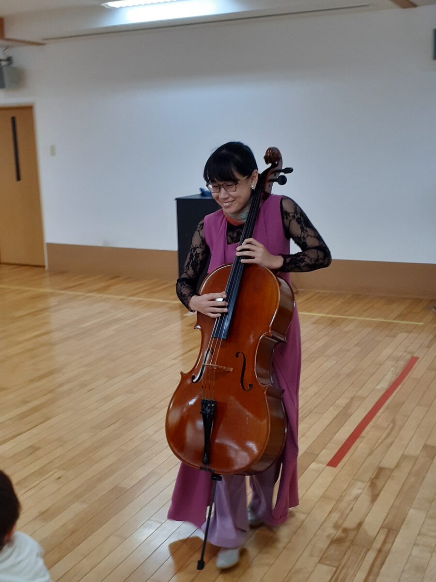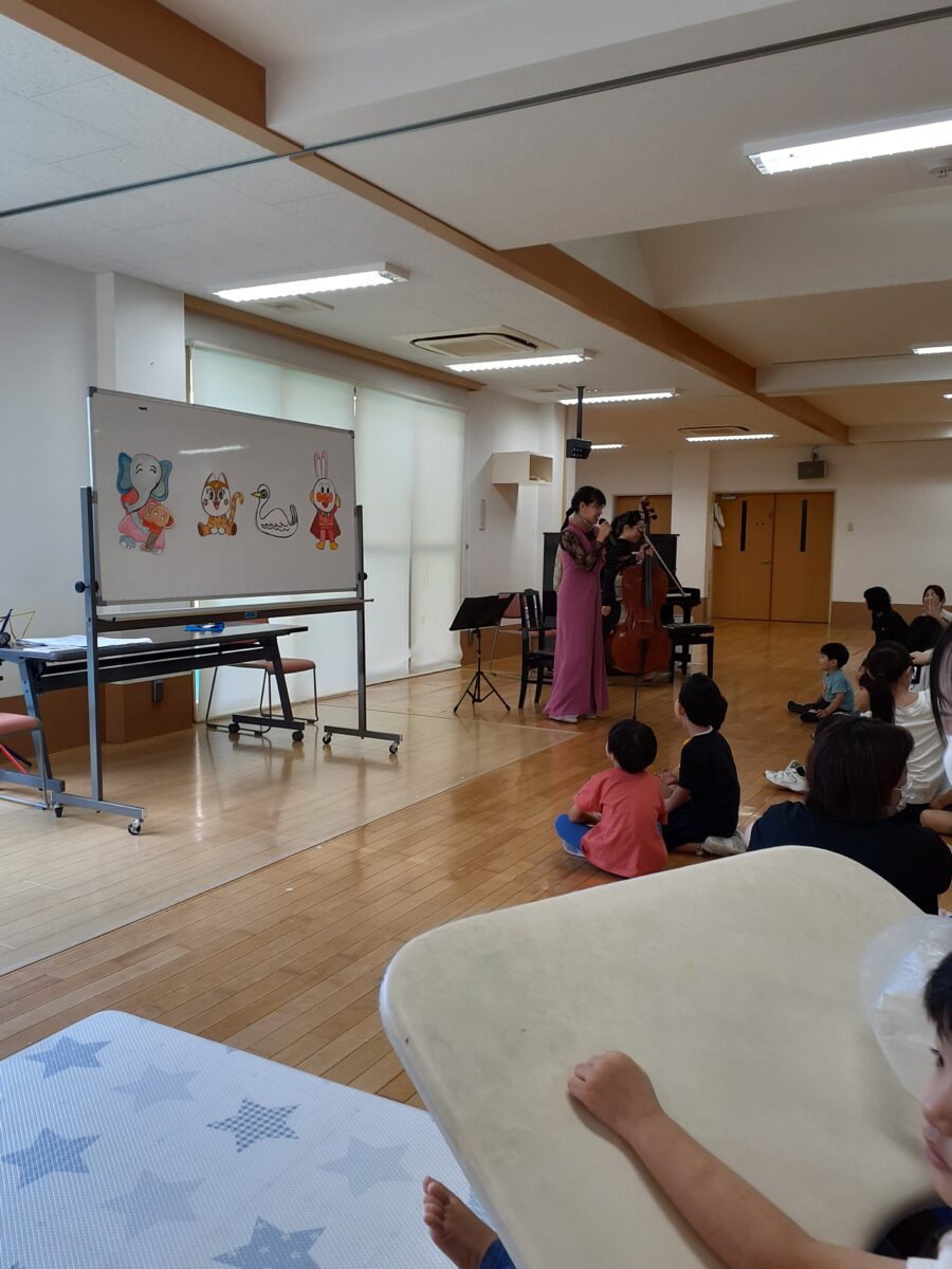 2025.10.29 10月行事(おでかけクラシックコンサート) 🎵~おでかけクラシックコンサートを開催しました~🎵 令和7年10月17日(金)、つばさ学園では月1行事「おでかけクラシックコンサート」を開催しました。今年は、チェロ奏者の河野里菜様とピアニストの竹下杏奈様をお招きし、心に響く素敵な演奏を披露していただきました。 子どもたちにとっては、チェロを間近で見るのは初めての体験だったようです。演奏が始まると、その深く温かい音色に引き込まれるように、みんな真剣な表情で聴き入っていました。チェロとピアノが織りなす美しいハーモニーに、会場全体がやさしい音に包まれました。 今回のプログラムは「動物」をテーマにした曲が多く、「ぞうさん」「白鳥」「猫」など、子どもたちにも親しみやすい内容でした。「ぞうさん」は日本の童謡ではなく、フランスの“ぞうさん”の曲で、子どもたちはいつもと違うぞうさんの姿を思い描いていました。「白鳥」では「この湖にはどんな動物たちが集まってくるかな?」と想像を膨らませながら耳を傾け、「猫」ではチェロの音色の中に猫の鳴き声のような音を感じ取り、「猫だ!」と嬉しそうに声をあげる姿も見られました。(実はピアノの音色にも猫の鳴き声が隠れていて、それに気づいた子も!。)普段なじみの少ないクラシック音楽が、子どもたちにとって身近で楽しいものになったようです。 また、コンサートの中では「アンパンマンの歌」をみんなで歌ったり、朝の集まりでおなじみの『だるまさん』の絵本を音楽付きで楽しんだりと、音と絵が一つになった臨場感ある時間を過ごしました。 音楽を通して、子どもたちの表情がどんどん輝いていくのが印象的でした。最後には、チェロとピアノの演奏を聴いて感じた気持ちを、画用紙にお絵描きして表現しました。思い浮かんだイメージや色を自由に描きながら、一人ひとりが音楽から感じた“心の動き”をのびのびと表していました。 河野様、竹下様、素敵な演奏をありがとうございました。子どもたちにとって、音楽の楽しさや表現する喜びを感じる貴重な時間となりました。 Post Share Pin it 9月行事(わくわく実験教室)